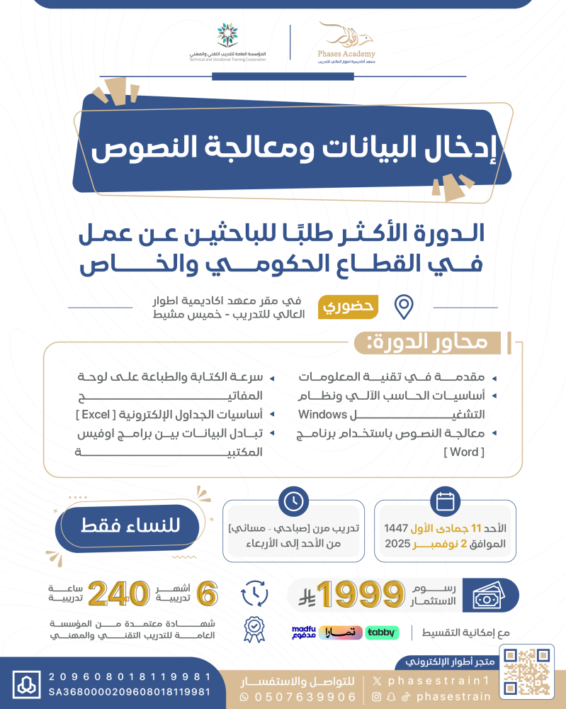 دورة إدخـــــــــــــــــــال البيـــــانـــات ومعــــــالجــــة النــــــصوص "حضوري للنساء"