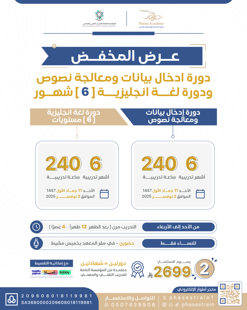 " دورة إدخال بيانـات ومعالجة نصوص + دورة لغة انجليزية “ 6 “ شهور "