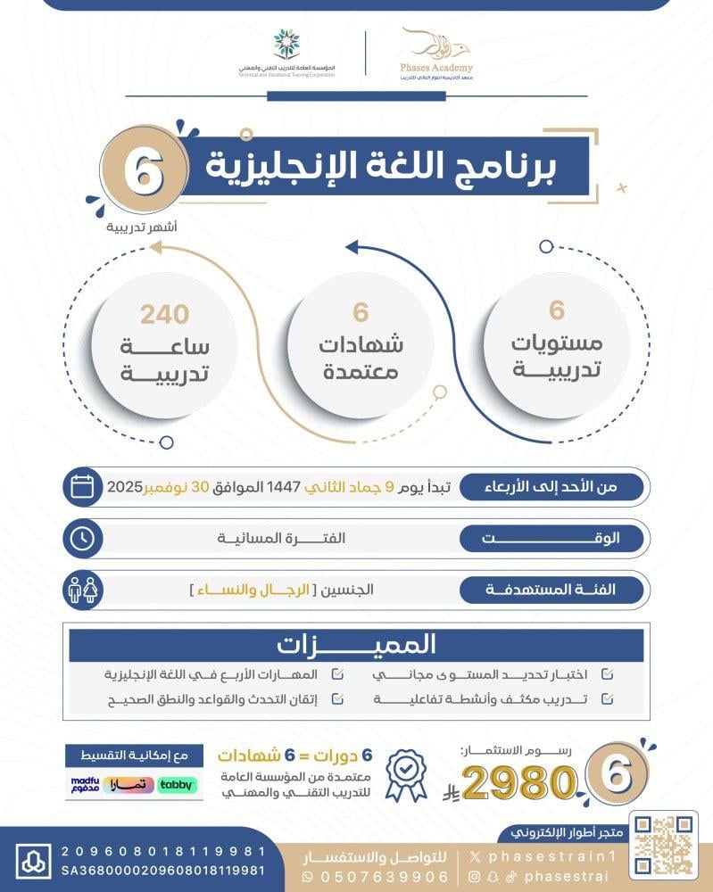 6 مستويات تدريبية =6شهادات معتمدة =240ساعة تدريبية ..