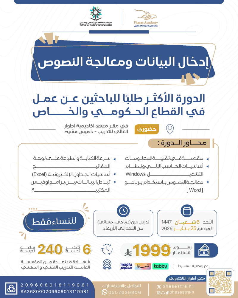 دورة إدخـــــــــــــــــــال البيـــــانـــات ومعــــــالجــــة النــــــصوص "حضوري للنساء"