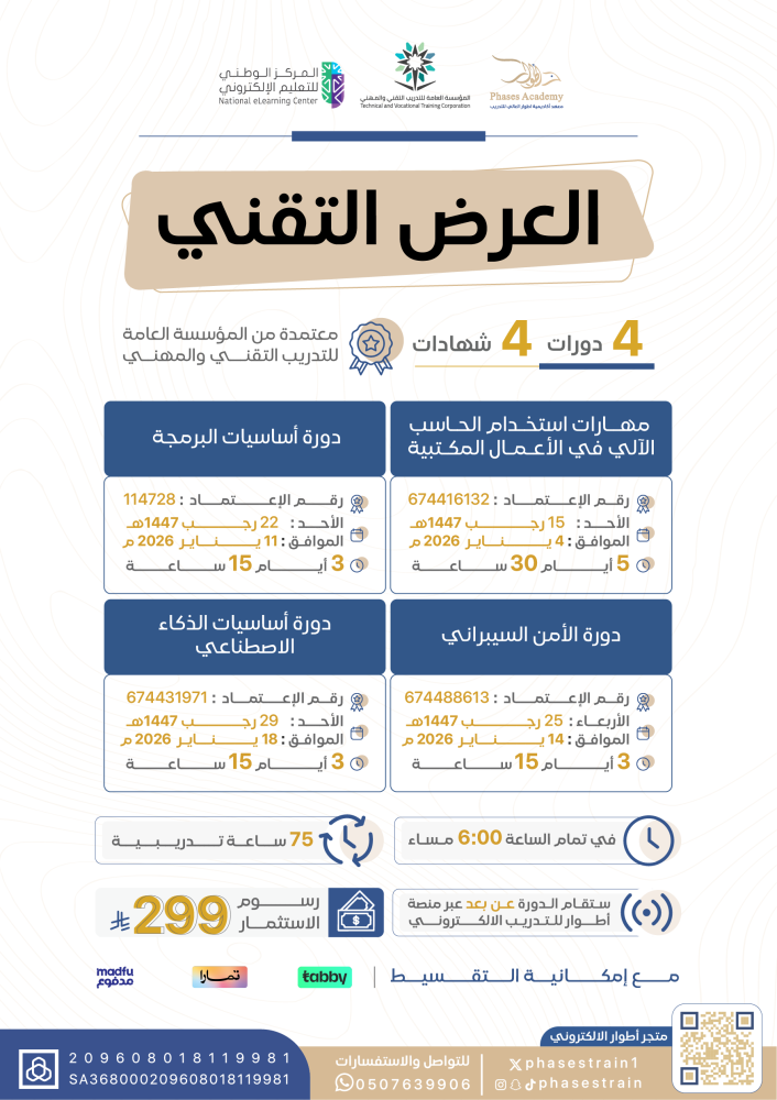 4 دورات = 4 شهادات تدريبية معتمدة من المؤسسة العامة للتدريب التقني والمهني .