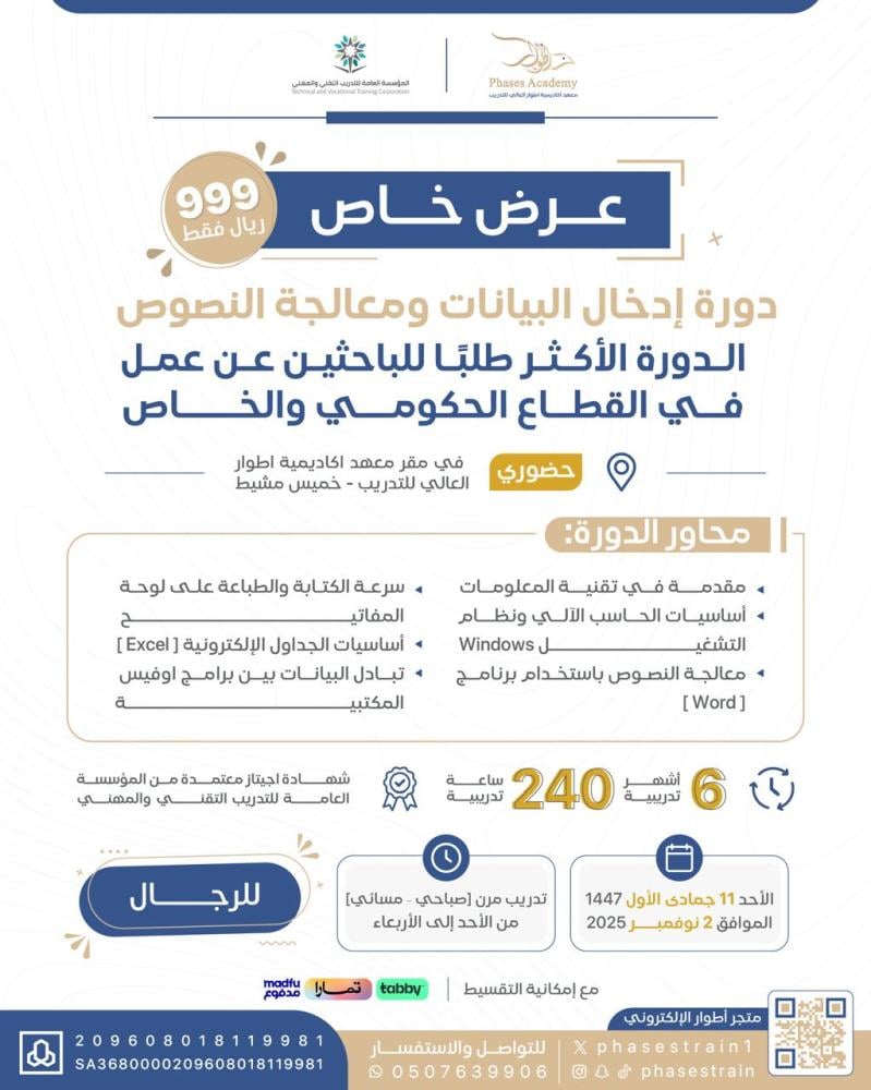 دورة إدخـــــــــــــــــــال البيـــــانـــات ومعــــــالجــــة النــــــصوص "حضوري للرجال "
