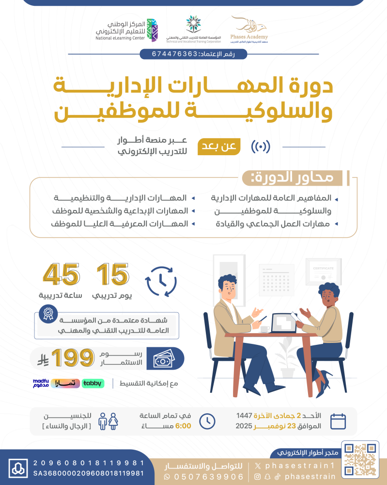 بـــــــــــــواقع 45ســاعة تدريبية لــمدة 15 يـــوم تدريبي ...